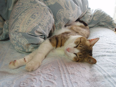 私の布団の上で堂々と寝すぎだろシマにゃん。